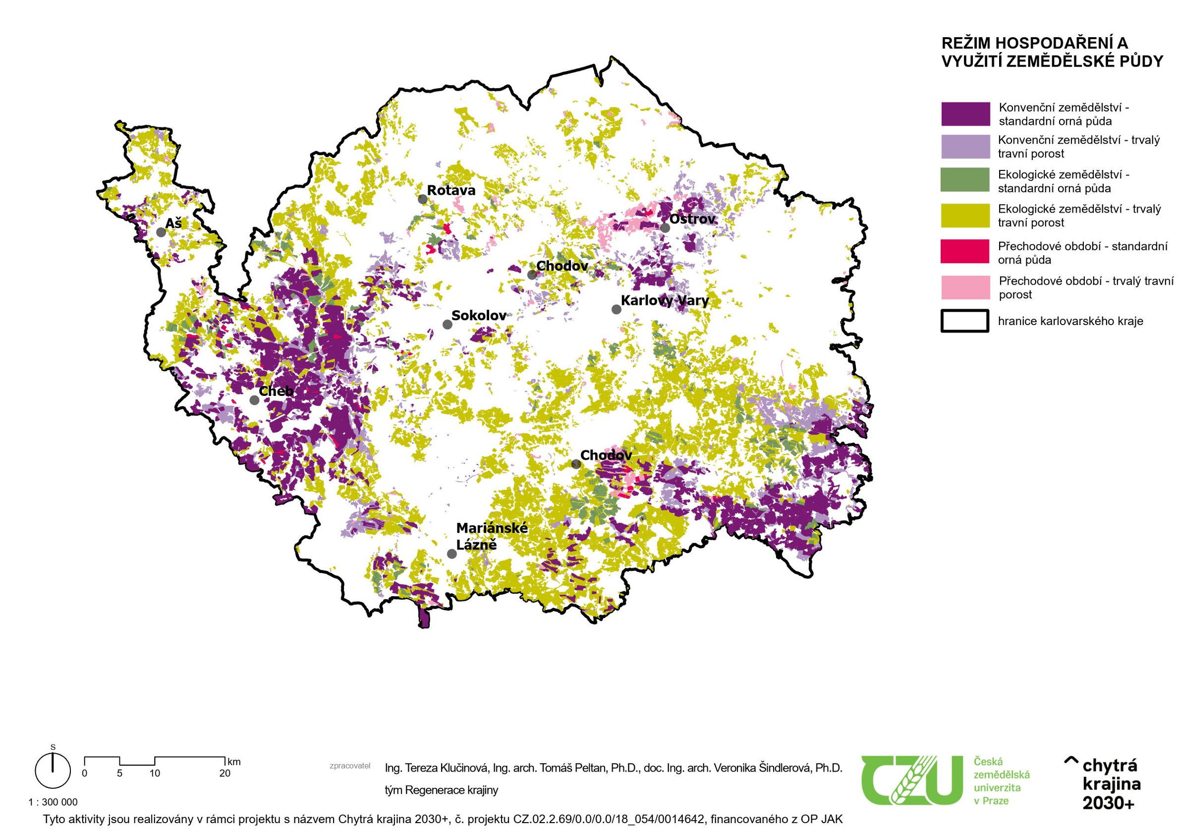 Na mapě vidíme, že Karlovarský kraj jsou vlastně dva kraje v jednom. V Chebské pánvi a části Sokolovska převažují velké bloky konvenční orné půdy s pšenicí a řepkou, ale Toužimsko, Bochovsko, nebo Slavkovský les a krajina směrem ke Krušným horám tvoří mozaiku menších bloků trvalých travních porostů v ekologickém hospodaření nebo v přechodném režimu. Výsledkem je nižší průměrná intenzita produkce, ale zároveň výrazně vyšší úroveň ekosystémových služeb – lepší retence vody, menší erozní riziko a vyšší biodiverzita.